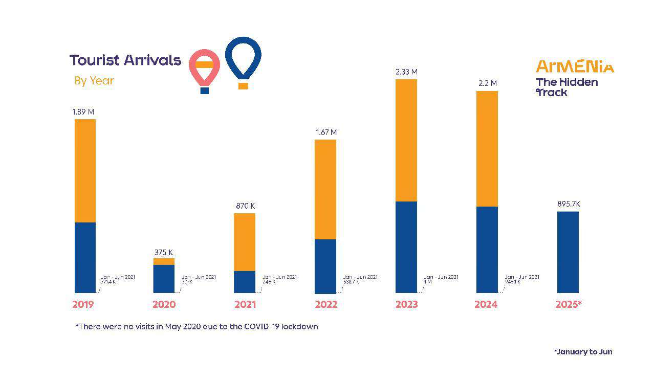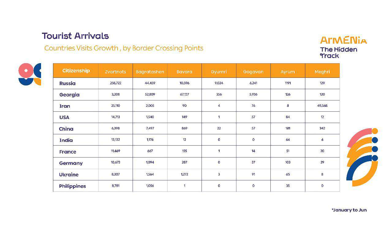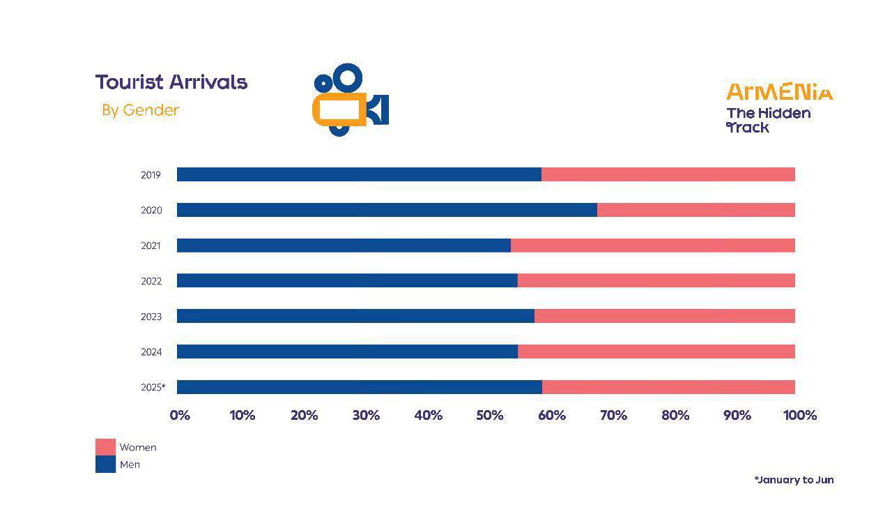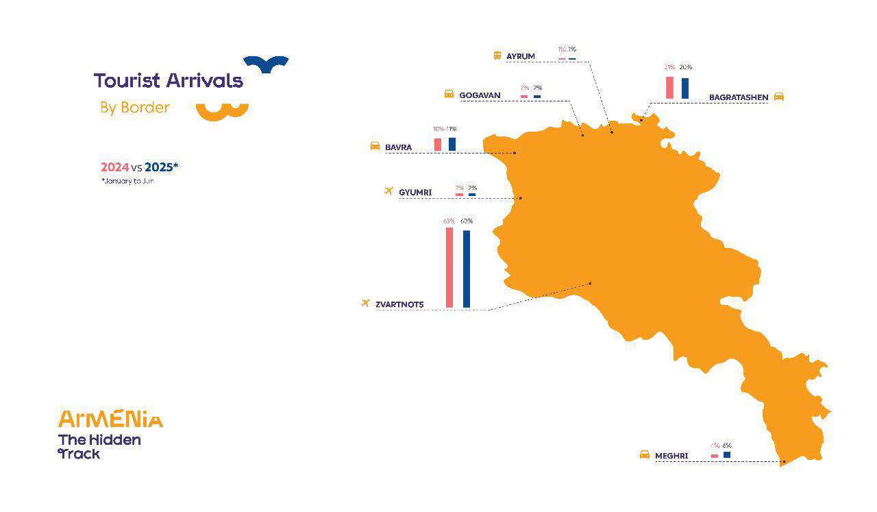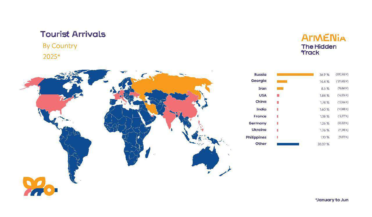 2025 թ․ հունվար-հունիս ամսին դեպի Հայաստան առավել շատ զբոսաշրջային այցելություններ գրանցվել են Ռուսաստանից (36.9%), Վրաստանից (14.4%) և Իրանից (8.5%):