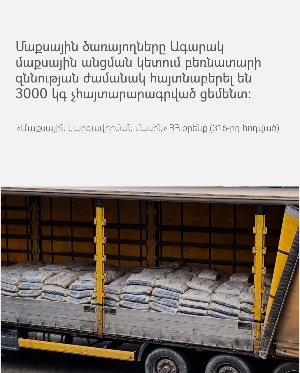- Բեռնատարից հայտնաբերվել է 3 տոննա չհայտարարագրված ցեմենտ