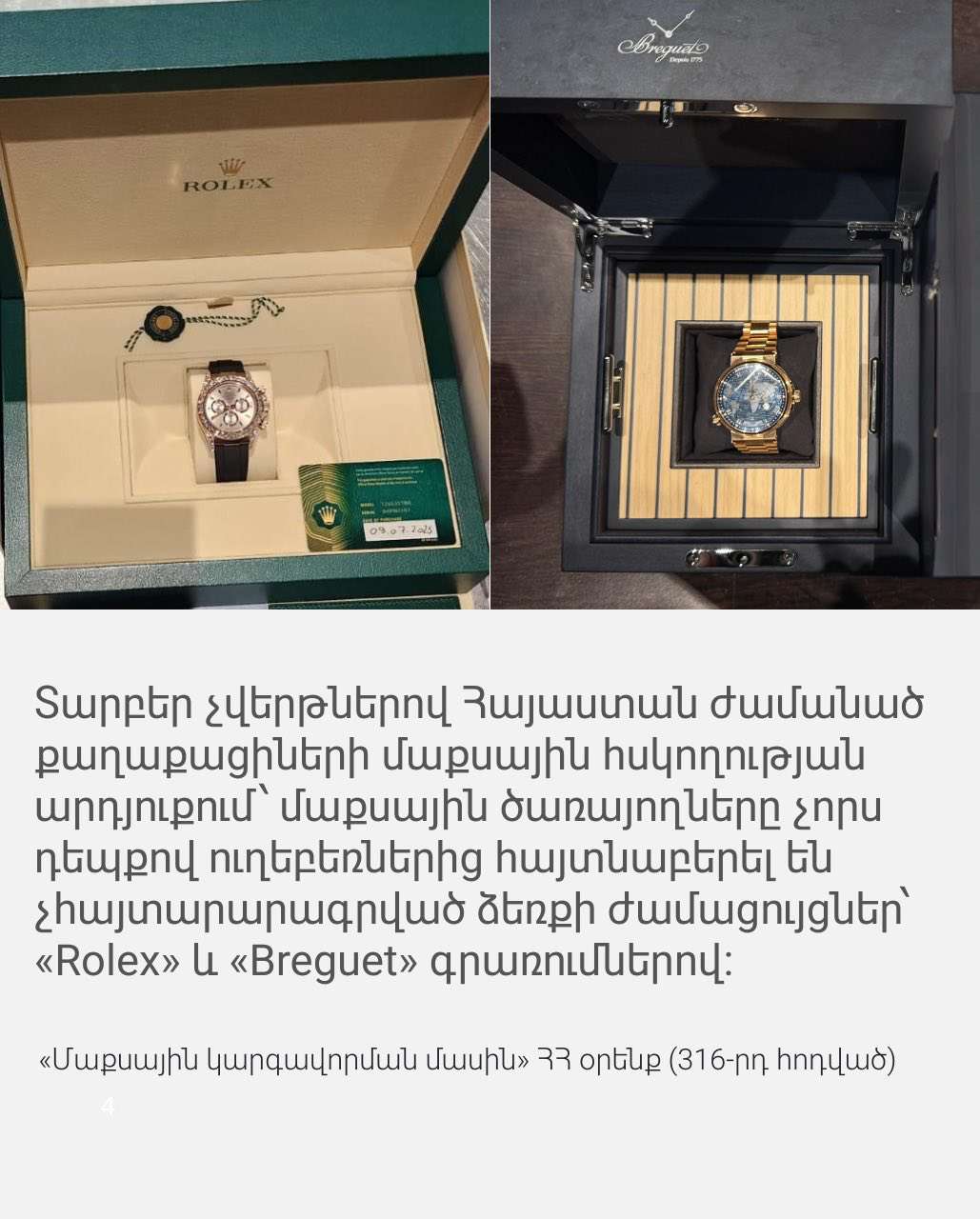- Օդային ճանապարհով մի քանի դեպքով փորձ է արվել Հայաստան ներմուծել ձեռքի ժամացույցներ