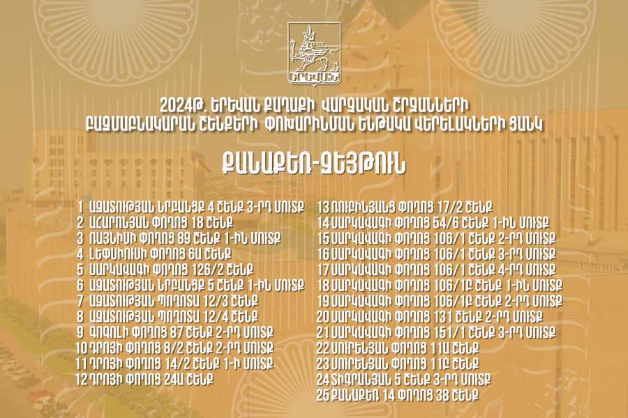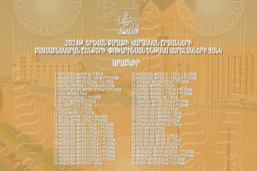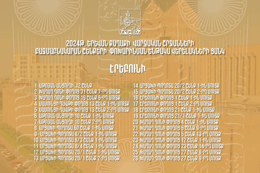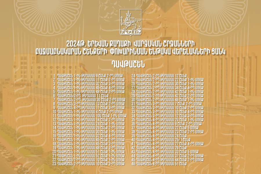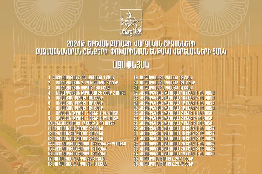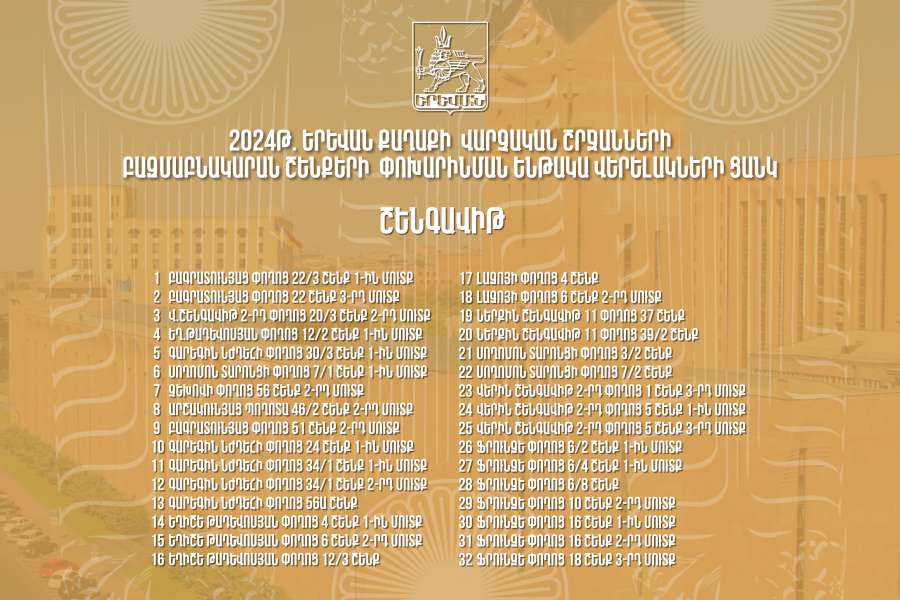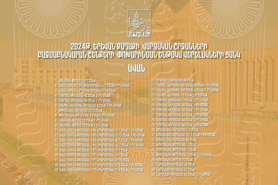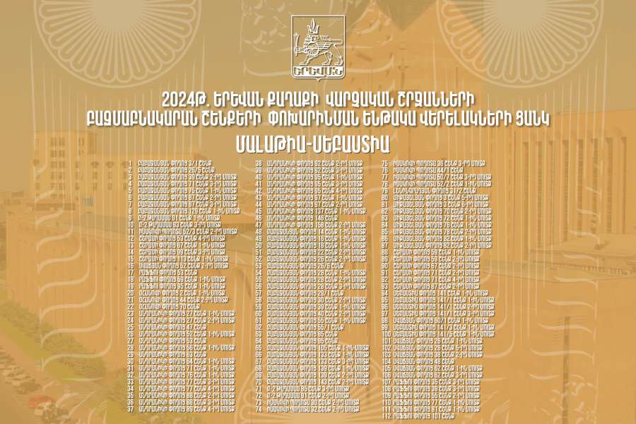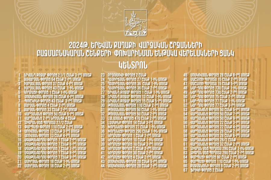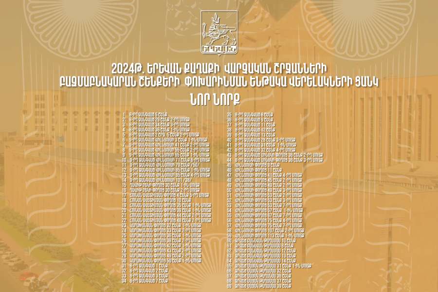 Երևանի քաղաքապետարանը հրապարակել է 2024թ. ընթացքում մայրաքաղաքի վարչական շրջանների բազմաբնակարան շենքերի փոխարինման ենթակա 500 վերելակների ցանկը։